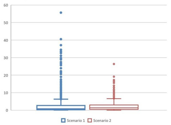 Thus, several flights were unable to maintain their short as-flown routes. The results for the SSPD metric are shown in more detail in Figure 12 and confirm that most flights have very similar routes. For these routes, the SSPD is within the interquartile range while some outliers have SSPDs outside. Especially the whiskers, which mark a distance of 1.5 times the interquartile range to the median, are very close to the first and third quartile, around a value of 7 for both scenarios.
