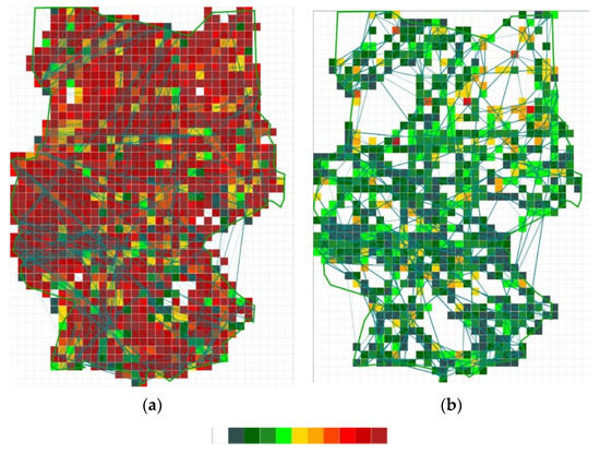 Structural complexity for intersections (a) and reduced main-flow network (b) for Scenario 2.