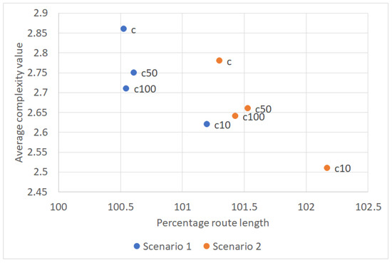 With (8), and therefore adopt values between 0 and 9. Thus, in Equation (9) can increase the route length of at most by nine percent. The average complexity values over all cluster centers and the proportion of average and original trajectory lengths in percent to the original trajectory have been compared for several denominator values (Figure 16). A denominator of 100 leads to a good compromise between the length of the trajectory and the reduction of the structural complexity. The “Percentage Route Length” relates the lengths of optimized trajectories created with (step C) to their original length. The average complexity value is determined in step D and therefore corresponds to the reduced trajectories. Although the results for the scenarios are on different levels in Figure 9, the structures are the same. A denominator of 50 leads in both cases to inferior results for the complexity value and the route length. A value of 10 prefers structural cluster complexity to trajectory length.