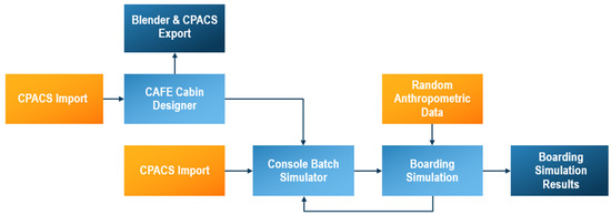 Figure 2), with the latter one being the focus of this publication. It enables the batch simulation of cabin scenarios generated with Monte Carlo based passenger and boarding properties and also contains movement and pathfinding models. The cabin input required for the simulation is delivered by the cabin configurator module, which allows for an import, modification and export of CPACS files. Additionally, common design rules and CS25 conformability can be assessed.