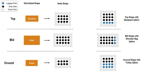 A potential carry-on luggage is amended to the human body at respective height layer (see luggage nodes in