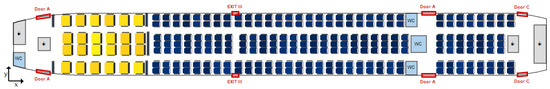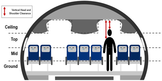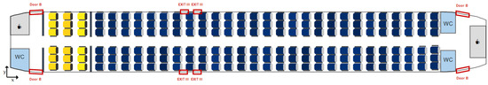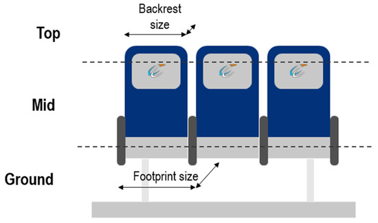 Figure 4 highlights the seat dimensions used for the discretized shape of cabin seats at the different height layers. As the width of a seat is almost identical at the armrest and floor level, the same dimension is used for the lower two layers. The top width is smaller due to the slimmer backrest dimensions. Considering the depth of the seats, each layer has a different dimension, beginning at the floor level with the base footprint size, continuing to the middle layer, where the armrest dimension is critical and ending at the top width of the seat, consisting of the backrest depth.