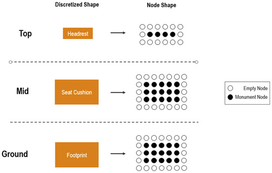 Figure 5 depicts the transition of the cabin seat into a discretized rectangle inside the PAXelerate node grid for each of the different layers. All other cabin monuments such as lavatories or galleys are modelled in the same way. However, monuments with a vertical wall are modelled with the same dimensions in each of the layers. The overhead bins are not considered cabin monuments and are thus not included in this modelling approach but rather dealt with in a separate fashion as described in a later section.