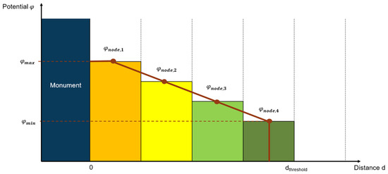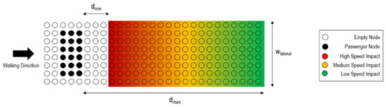 , creating a so-called influence area (see Equation (1)). This is the core method of reducing the computation effort by pre-calculating the linear distance between objects for each simulation step. This is feasible, as each node knows its own position to the closest object in advance. A passenger walking through the nodes within this influence area will decrease their walking speed depending on the node’s properties and the pre-calculated distance value
