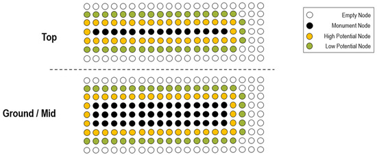 Ideally, the distance between each geometry surface of every element within the cabin and the passenger itself has to be calculated at every time step of the simulation in order to get an exact measurement of the surroundings of a passenger. The problem therein is the immense computational effort required to calculate 3D distances of every object surface to every passenger as well as all passengers amongst each other. As the procedure has to be repeated for every time step, there is a need for a more simplified approach, which can reduce the calculation effort by increased model abstraction, while yielding sufficient information for a reasonably accurate simulation. The solution to this problem lies in the structure of the PAXelerate boarding simulation, which consists of a discretized cabin area built out of a grid of nodes. As these nodes represent a specific location, each node can also contain the distance information to the closest cabin monument. It is thus possible to pre-calculate the distance of every node within the cabin to the closest monument in advance of a batch simulation, thereby reducing the required number of calculations to just one. This can be done given that no cabin monument changes position throughout the simulation loops.