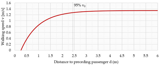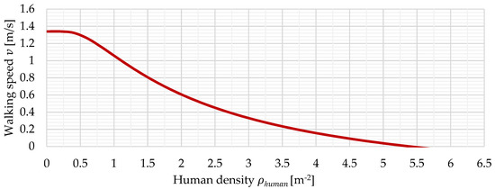 30]. With increasing density, the available space for each passenger decreases. The step length and/or frequency will be reduced and walking speed will decrease. Above a certain density, the remaining space for every passenger is just sufficient to stand, but it is no longer possible to walk.