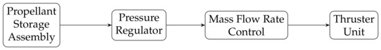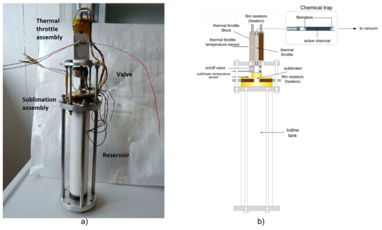 The vapor generator sublimates the solid iodine obtaining vapor at pressure and temperature conditions contained on the solid–gas phase equilibrium line seen in the phase diagram of Figure 2. This means that, instead of requiring a pressure regulation system between the tank and the mass flow control, the pressure at which the propellant leaves the tank can be regulated through the thermal control system of the storage assembly. The result is a much simpler architecture, obtained by merging the two first basic elements into a single pressure regulated storage assembly. This strategy has been applied in the systems developed in the past [5,13,14,15,16], in which the temperature of the whole tank is controlled to regulate its internal pressure. These systems provide mass flow control through the use of Proportional Flow Control Valves (PFCV) or Thermal Throttles.