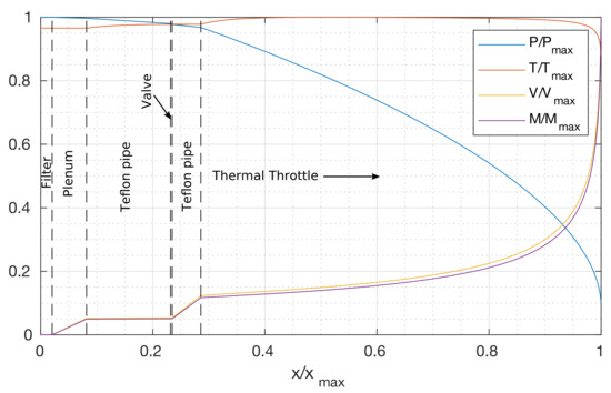 The model is solved by means of a shooting method for a certain pair of set-point values for the sublimation body temperature and a thermal throttle temperature . Having set these temperatures, a value of is proposed. The equations are solved advancing towards the exit until the last node. The values of , , and are thus obtained. With these values, the value of is calculated. In case is not verified at the throat, is corrected and the calculations are restarted with this new value, repeating until convergence to the sonic condition is attained. The output of the solution is a distribution of P, V and T along the whole system. An example of the results is shown in Figure 5.