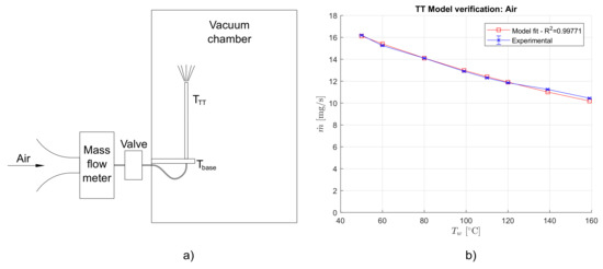 A series of tests were performed aimed at contrasting the thermal throttle model with experimental measurements. The experiment consists in measuring the air mass flow rate passing through a heated capillary pipe at different pipe temperatures. A fused silica gaschromatograpy tube with an internal diameter of 0.53 mm and a length of 200 mm was mounted inside an Inconel pipe. The external pipe had a coupling for the silica tube on one extreme and was open on the other. The Inconel tube is wrapped with a constantan wire for heating, while a Pt100 thermistor measures its temperature with an accuracy of 1 . The pipe was mounted on a stainless steel support, whose temperature was also controlled, so as to have a uniform temperature along the pipe length. The device has been placed in a vacuum chamber, as shown in Figure 6a. The pipe inlet has been connected to the atmosphere by means of a fluidic feedthrough. A mass flow meter (mod. EL-FLOW, by Bronkhorst, Ruurlo, The Netherlands) has been placed between the feedthrough and the atmosphere. A vacuum in the chamber, of the order of 1 Pa, assures chocking condition at the pipe exit. The mass flow meter measures the air flow with an accuracy better than 0.05 mg/s. As the air comes from the atmosphere, the total pressure and temperature of the working fluid could be easily known at the pipe inlet from measurements of the laboratory atmospheric conditions.
