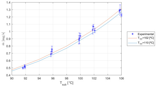The observation of Figure 10 shows that, after calibration, the model and the experimental results correlate acceptably. It also shows that, as the mass flow rate increases, the thermal throttle control capability also grows, i.e., the mass flow rate variation it can produce is larger. As a consequence, higher operative temperatures should be attempted in the future to increase the thermal throttle capacity.