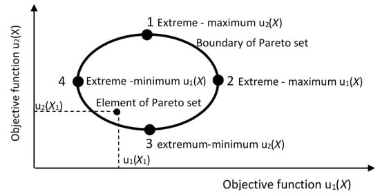 The goal of optimization is to find a non-dominant solution that requires the functions to be in contradiction (conflict). A change of variable X for one function towards its required extreme value delays the second function from its required minimum/maximum. A more detailed description of multi-objective optimization by means of Pareto sets can be found in literature [] or [].