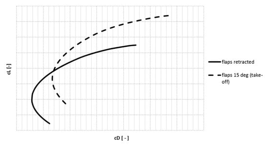 Polar graph of the aircraft for cruise (i.e., flaps retracted) and take-off configuration (i.e., flaps 15°).