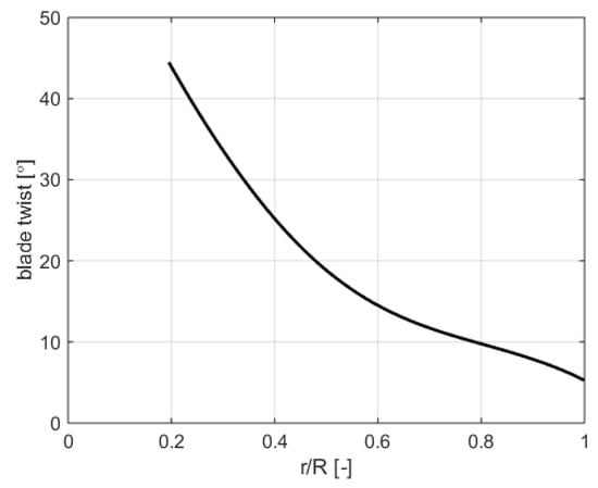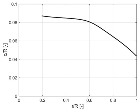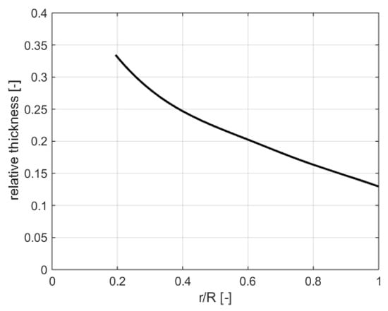 The propeller family is created as a group of geometrically similar propellers. Propeller blade geometry is derived from a three-blade propeller suitable for a 73.5 kW (100 hp) piston engine. The three-blade propeller was extended to other numbers of blades: two-blade, four-blade, five-blade, six-blade and eight-blade propeller with eleven pitch blade angles from 15° to 40° at 75% of radial distance. Geometric characteristics of the propeller are presented in Figure 3 (blade-chord distribution), Figure 4 (blade twist distribution) and Figure 5 (relative airfoil thickness). Clark Y airfoil is used. Range of propeller diameter of the total propeller family was from 1.1 m to 2.65 m, but each number of blades for a given pitch blade angle is only a part of this range. An extremely overloaded propeller that reaches the permissible engine RPM practically at the beginning of the take-off limits the smallest diameter. The maximum diameter represents a very lightly loaded propeller, and thus, the take-off is unacceptably extended, and the climbing rate is reduced.