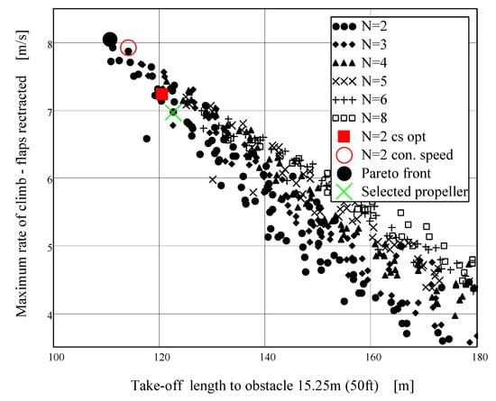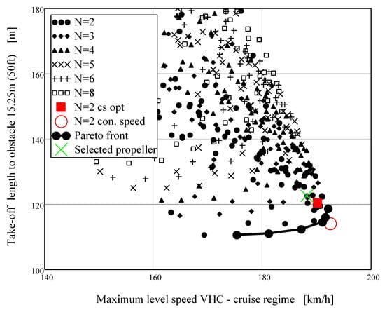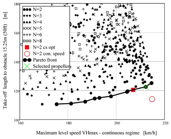 Points on the Pareto front for maximum horizontal speed (continuous engine regime) and take-off length (see Figure 7).
