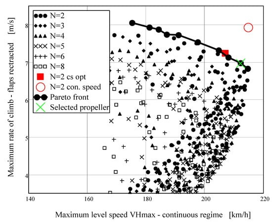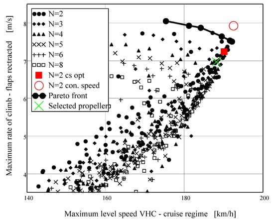 Points on the Pareto front for maximum horizontal speed (continuous engine regime) and maximum rate of climb (take-off engine regime) (see Figure 8).