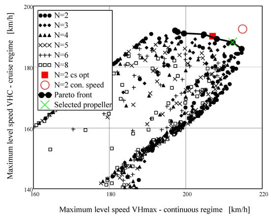 Points on the Pareto front for maximum horizontal flight speed (continuous engine regime) and maximum horizontal flight speed (cruise regime) (see Figure 11).