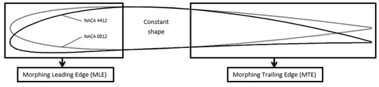 In this research, a NACA0012 airfoil is considered, which will be morphed by the MCS mechanism into a NACA4412 airfoil. This morphing is equivalent to modifying the grey airfoil (NACA0012) to the black airfoil (NACA4412), as shown in Figure 1. In this figure, these two airfoil shapes are each divided into three sections: the leading edge, the center box and the trailing edge. The center box is the same constant shape and is thus un-modified for both airfoils while the leading and trailing edges are different for both airfoils. The NACA0012 and NACA4412 airfoils were considered because they have the same thickness, and the only difference between their shapes lies in their cambers. This is the reason why this new system is called a “Morphing Camber System” (MCS).