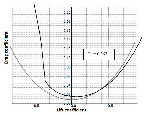 Equation (7) allows the calculation of the induced drag coefficients for the UAS-S4 wing from the lift coefficients of the wing. Then, with Equation (11), the combination of wing and fuselage drag coefficients of the UAS-S4 are plotted (Figure 27).