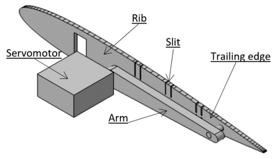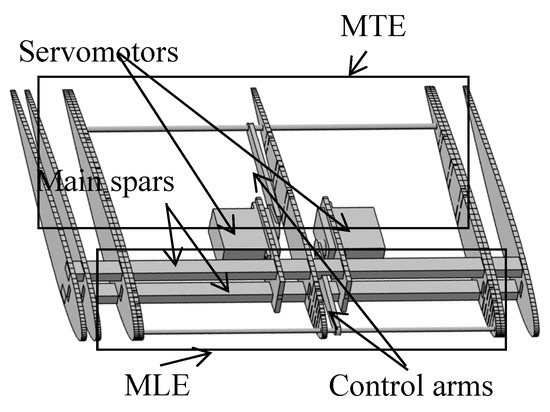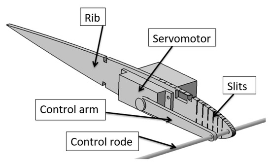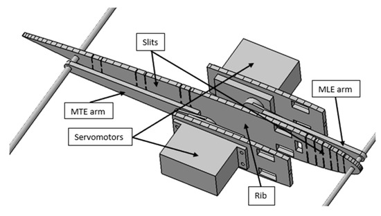 Figure 8 shows the internal structure of the wing with its MCS. In previous prototypes (MTE and MLE), the servomotors were fixed on the central rib. The MCS required two servomotors; two servomotor brackets were added next to the central rib on the wing structure. All other features of the design (ribs with slits, main spars, control rods, control arms), as shown in Figure 8, were designed in the MTE, for the rear part of the wing, or in the MLE, for the front part of the wing.