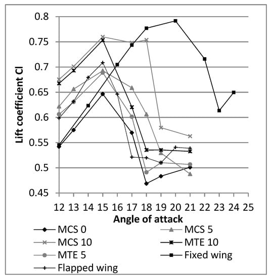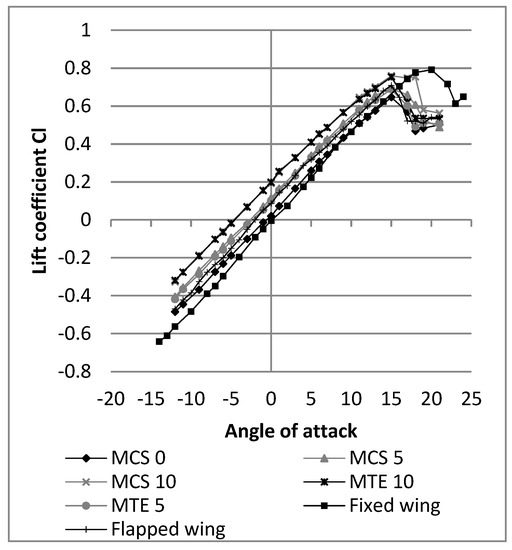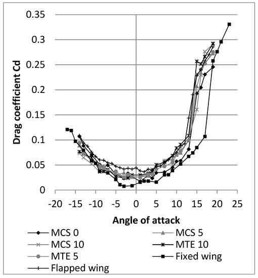 For each of these cases, the drag (Figure 16) and the lift (Figure 17) forces variation curves with the angle of attack were plotted using measurements carried out in the wind tunnel. From these measured values, the performance of the wing with the MCS was studied. The drag coefficients’ variation showed in Figure 16 that the wing with the MCS generated more drag than a fixed wing (without control surface) for an angle of attack higher than −7° and that its stall angle was lower by 4°. The difference in the variation of the drag coefficient obtained for each morphing case was too small to be analyzed from Figure 16.