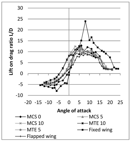 Figure 18 shows that the L/D variations with the angle of attack values are close to each other for each of morphing camber cases. The maximum L/D tends to shift to the left of the curves (closer to the angle of attack 0°) when the morphing of the camber increases. It is also shown that the MCS reduces the L/D of the wing for angles of values of 5° to the stall angle, but for angles smaller than 5°, the MCS gives the highest L/D.