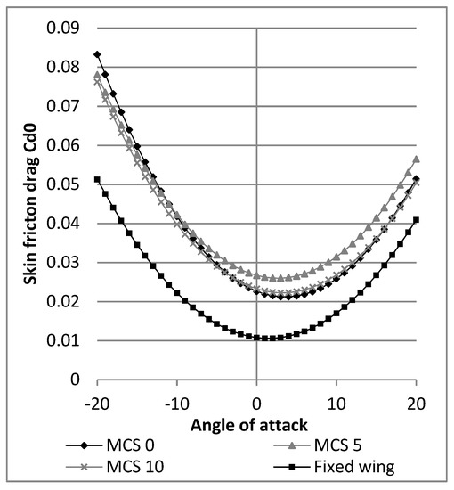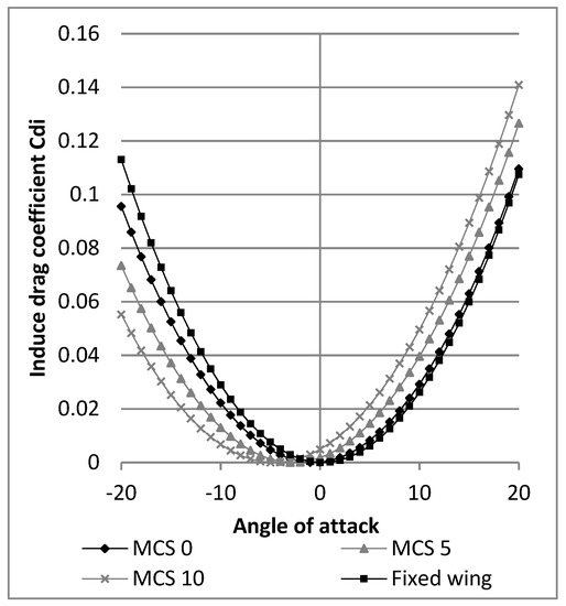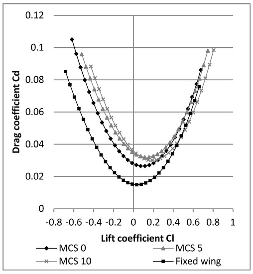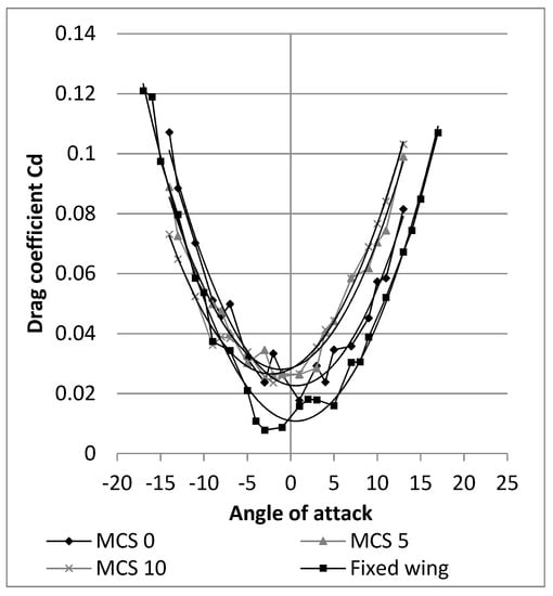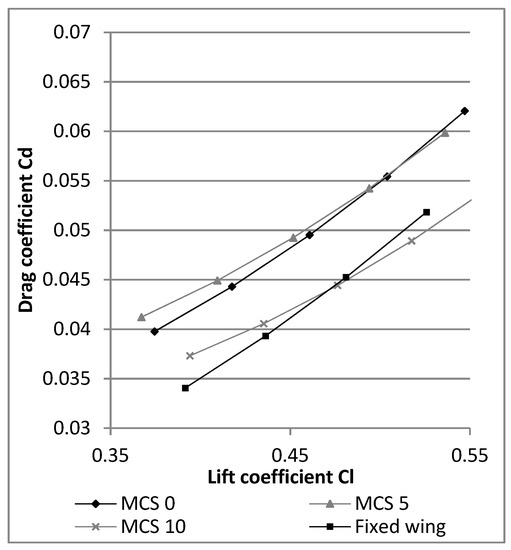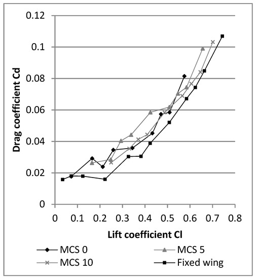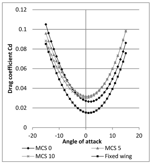 As shown in Figure 20, for the same lift value, the fixed wing generates less drag. However, as seen in Figure 17, for the same lift value, the angle of attack of the MCS is lower than that of the fixed wing. This observation implies that the angle of attack of the fuselage for an aircraft using the MCS will be lower than the angle of attack of the fuselage of a conventional aircraft. The variation of the drag coefficient with the lift coefficient is recalculated using the UAS-S4 wing and fuselage geometry as the fuselage geometry needs to be considered. The drag and lift coefficients of the fuselage were obtained using the UAS-S4 in-house simulator for flight conditions corresponding to the wind tunnel tests (20 m/s) [33]. The drag and lift performance of the wings were obtained by using Equations (3), (4) and (8) to (10) with the previously calculated clα and Cd0 values, and by use of the wing geometry of UAS-S4.