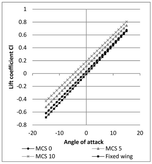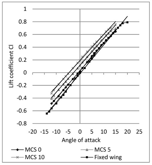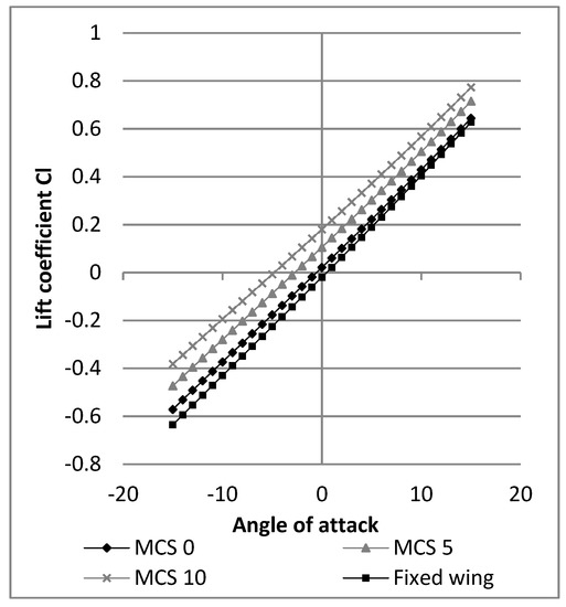 The following figures and discussion will only consider the MCS 0, MCS 5, MCS 10, and Fixed Wing cases to improve the visibility of the curves. However, these curves alone cannot assess the effectiveness of the wing with the MCS because of the fact that for a given angle, the MCS provides more lift, but generates more drag, than a fixed wing. In the next section, the methodology to conclude on the effectiveness of the MCS is discussed.