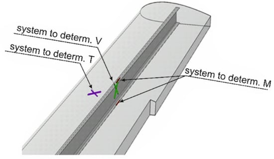 The idea of measurements taken using strain gauges is connected with the assumption of the work of the structure as a semi-monocoque structure [7,8]. Under such conditions, the wing spar caps transmit axial loads only, which are the effect of the bending moment, while the spar wall and the other part of the skin work for shear only. It, thus, becomes possible to connect the occurrence of the essential cross-sectional forces and moments with the strains in the semi-monocoque structure elements. The system of three strain gauge bridges, as presented in Figure 2, enables us, once it is calibrated, to determine the section load components using Equation (1):