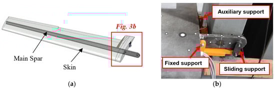 For the purpose of the study, a single-spar composite cantilever wing with a constant aerodynamic profile (NACA 4415) was made. The channel-sectioned spar was built from carbon fabric and additionally reinforced with carbon roving on the junctions of the shelves and wall. The wing skin was a sandwich-thin shell made of four carbon fabric layers, with an axial configuration of ±45° and with a core of polyurethane foam. The whole spar was covered with one glass fabric layer.
