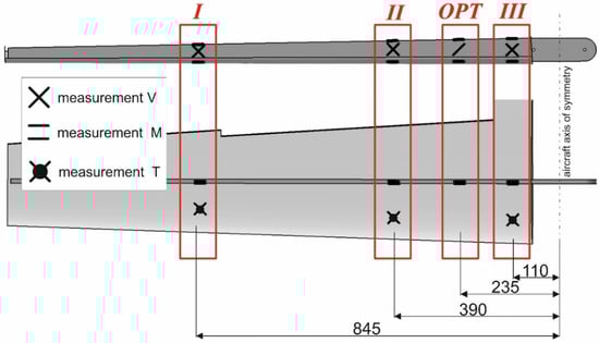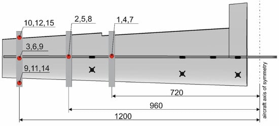 Systems I, II and III comprised 30 electrical resistance strain gauges in total (Figure 4 and Figure 5). All used electrical sensors were manufactured by HBM company (Hottinger Baldwin Messtechnik GmbH, Darmstadt, Germany), they were general purpose strain gauges with 10 mm gauge length and 120 Ω nominal resistance. Electrical strain gauges were bonded to the composite structure of the wing using HBM Z70 cyanoacrylate adhesive.