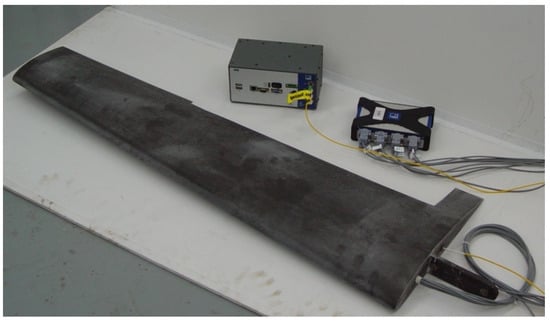 However, special attention needs to be paid to the development of alternative measuring techniques based on fibre optic strain gauges called Fibre Bragg Grating (FBG) sensors, which are low in weight and can thus be used in the classes of the structure in question. There are many examples in the literature of using this kind of sensor in research, including fatigue crack growth measurements [15], detection of the delamination [16,17], stress and strain state monitoring [18,19,20] and life cycle monitoring of composite structures [21,22]. There are also examples of the testing of aircraft structures. Iadicicco et al. [23] presented the application of FBG sensors to monitor the strain state of composite aircraft landing gear. Orkisz et al. [24] used FBG sensors to measure strain level change due to fatigue tests of the composite spar of a motor sailplane. Ramly et al. [25] described the design and development of a part of a vertical stabilizer in the form of a composite sandwich panel with embedded FBG. Ruzek et al. [26] and Tserpes et al. [27] published papers devoted to strain and damage monitoring in Carbon Fibre Reinforced Plastics (CFRP) fuselage panels using FBG sensors. Ryu et al. [28] used numerous built-in FBG sensors to carry out buckling behaviour monitoring of a composite wing box. Recently, Ma and Chen [29] summarized applications of FBG to wing shape measurement. Nicolas et al. [30] published research results based on the testing of a composite wing with hundreds of built-in types of constant FBG sensors.