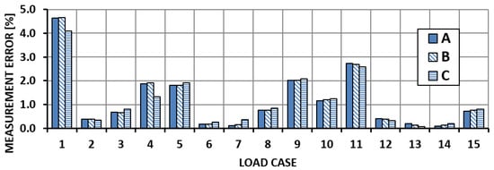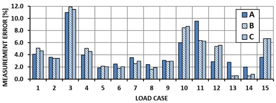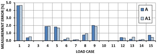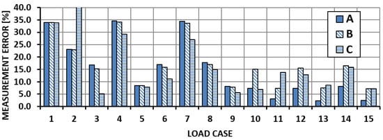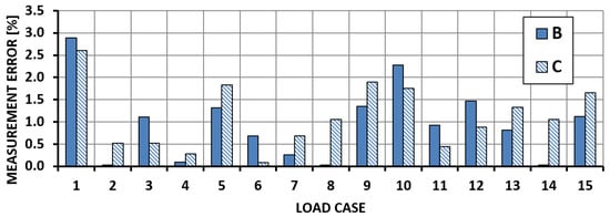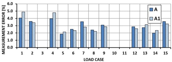 Each case led to the calculation of the β coefficients according to Equations (6)–(8) and to the determination of the cross-sectional forces and moments. The graphics below make up a comparison between the measurement errors (absolute values) for each load case under consideration. The absolute error values were calculated according to Equations (9), where subscript calib means values obtained with the use of Equations (3)–(5) and values without subscripts are the actual loads the structure is subjected to.