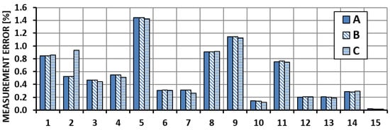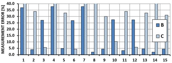 Figure 8, Figure 9, Figure 10 and Figure 11 show the distribution of errors in strain gauge readings for Sections II and III. The analysis of the results leads to the conclusion that the systems and the numerical calibration procedure applied to provide information on the bending moment acting in the section have a margin of error not exceeding 5%. The calibration results also show that the accuracy of the measured value is slightly dependent on the measurement system used.
