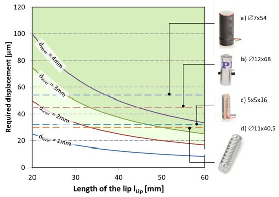 Required actuator stroke and lip length for various leverages (dlever) to achieve a deflection of 0.5 mm at the lip tip, compared with the stroke of different commercial stack actuators. (a) High voltage stack actuator type P-010.40 [18]; (b) High voltage stack actuator with housing type P-841.3 [19]; (c) Multilayer stack actuator type P-885.95 [20]; (d) Multilayer stack actuator with housing type P-885.91 [21].