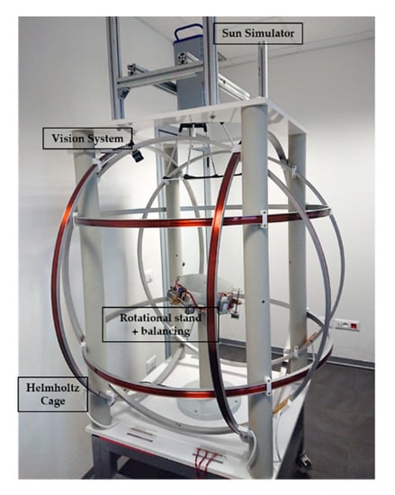 This paper is organized as follows. Section 2 describes the Helmholtz cage and articulated stand; Section 3 details the customized testbed rotational platform, with focus placed on the automatic balancing system and on the structural design aimed at minimizing the deformation. Section 4 describes the Sun simulator, with emphasis on the collimating lens calibration for minimizing beam divergence. Section 5 describes the ground truth monocular vision system, including the algorithms developed and the test campaign for accuracy assessment. Section 6 summarizes the main results of the commissioning phase of the whole facility, along with a perspective on future developments.