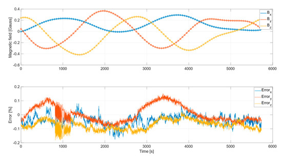 This commercially available of-the-shelf (COTS) equipment was customized for enhancing the accuracy when tracking a time-varying reference signal; this is, indeed, the main application scenario when testing a LEO satellite immersed in the geomagnetic field, which is experienced by the satellite as an almost periodic signal at the orbital period. To this end, a closed loop control was implemented, see Figure 2, making use of a high-precision fluxgate magnetometer (AP539, from Applied Physics Systems, Mountain View, CA, USA), placed inside the pedestal support of the articulated stand. To test the effectiveness of the closed loop control, we simulated the geomagnetic field profile experienced by a spacecraft travelling on a circular orbit having 550 km of altitude and 70° of inclination. The magnetic field profile commanded to the Helmholtz cage was computed using the International geomagnetic reference field (IGRF) model: results are shown in Figure 3. The feedback control allowed us to achieve a matching between the measured and commanded magnetic field below 0.2% (≈ 0.5 mGauss) along the three components Bx, By, Bz. Furthermore, it also allowed to verify a-posteriori the homogeneity level stated by the manufacturer, which was indeed retrieved thorough a series of measurements gathered at random locations within the control volume.