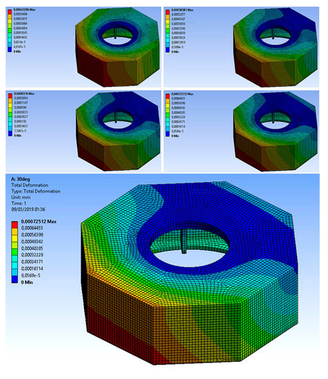 Total deformation of the octagonal platform as predicted by the FEM at various tilt angles (from top left to bottom right α = 10°, 15°, 20°, 25° and 30°).