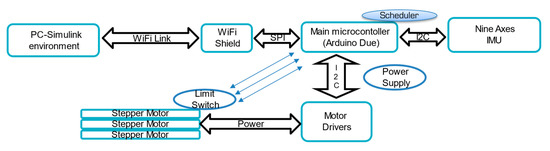 The motors are driven by an Arduino-based control system, powered by batteries (Figure 6). The controller algorithms run on an Arduino Due board, which exchanges data with a PC server through a Wi-Fi connection. Attitude and angular rates measurements are provided by an inertial measurement unit (nine-axes motion shield, from Arduino, Turin, Italy).