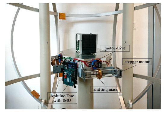 The effectiveness of the developed procedure for automatic balancing was tested experimentally on the platform equipped with the shifting masses and hosting a 1U CubeSat mock-up (10 × 10 × 10 cm size, ≈1.5 kg), as shown in Figure 7. Experiments were performed according to the following steps:
