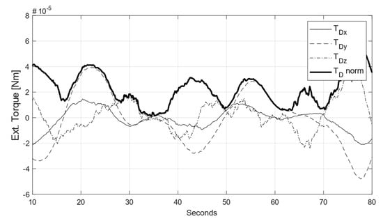 Once the balancing is completed, the residual disturbance torque, TD, is estimated, again through the sampling of free platform oscillations, by computing the angular accelerations retrieved from differenced IMU measurements. A sample outcome from such evaluation is depicted in Figure 8: the residual TD is below 5 × 10−5 Nm, with a root mean squared value of 2.5 × 10−5 Nm, corresponding to a residual unbalance offset magnitude of less than 1 μm.