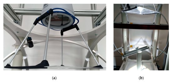 The core of the simulator is a COTS studio light whose primary intended use is not Sun simulation. The characteristics known from manufacturer are the type of LED used as a source, its CCT, and photometric data. Its design was thus customized for ensuring compliance with the main parameter of interest for our application, i.e., the beam collimation, by adding a Fresnel lens, see Figure 9a. The validation of the custom design was performed in two steps: first, a test campaign was carried out for adjusting the distance between the Fresnel lens and the LED source to obtain the desired collimation level of the light beam. Then, a second test campaign was performed to assess the temporal stability and spatial uniformity of the collimated beam. Both test campaigns employed as a sensing device a 1.3 MPx monochromatic CMOS camera (EO-1312M 1/1.8”, Edmund Optics UK, York, UK) equipped with a small pinhole aperture. The use of a CMOS camera as a light-meter was justified after verifying that a linearity dependence exists between the Sun simulator dimmer level and the raw readings from the illuminated CMOS (provided that the camera exposure time is properly set to avoid saturation).