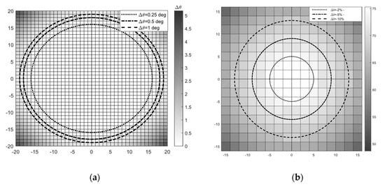 Attitude accuracy is obtained comparing the readings of the test rig to the output of the vision system. Figure 14a,b depict the variation of the error as a function of the outer axis position, resulting from two experiments (with and without lamp illumination) gathering 5500 images each, at a frequency of 20 Hz. Figure 14 and Table 5 summarize the results: the system keeps the root mean square error below 0.16° (10 arcmin), regardless of the Sun simulator activity. This value is considered suitable for testing a mid-performance nanosatellite ADCS subsystem, but it is not enough for validating high-end ADCS targeting to, or below, the arcmin accuracy range. Nonetheless, it can be achieved with an extremely simple setup: one camera plus one checkerboard.