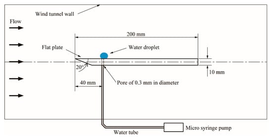 A pore of 0.3 mm in diameter was provided on the flat plate to introduce a water droplet to be pinned over the surface. It was located at 40 mm from the leading edge along the centerline of the plate. At this location, the boundary layer should be laminar based on the Blasius exact solution []. A micro syringe was connected to a mechanical pusher that allowed us to constantly inject water at 0.3 μL/min into the pore.