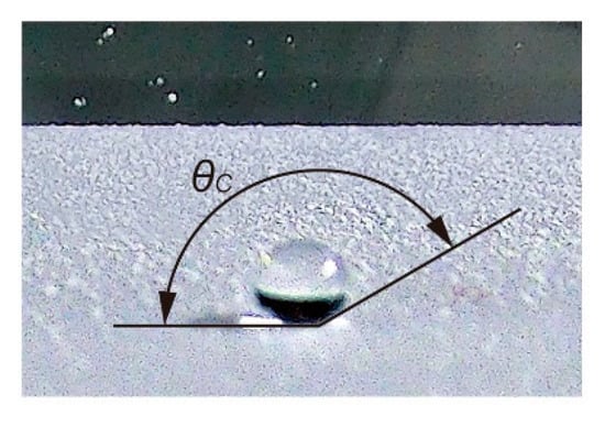 A superhydrophobic coating of HIREC 1450 (NTT A.T. Corp., Tokyo, Japan) was applied to the plate surface by spraying. The HIREC coating has demonstrated its superhydrophobic characteristic [,,,]. A water contact angle characterized the hydrophobicity of the surface under static conditions [,]. Figure 2 is an example of the shape of a water droplet on the coating surface. The water contact angle, θC, of the HIREC coating was 150 degrees. The contact angle of water repellent material is formulated as shown in Equations (1) and (2) [,]. Equation (1) describes the Wenzel model, which relates the contact angle, θC, to the contact angle of a smooth surface, θS.