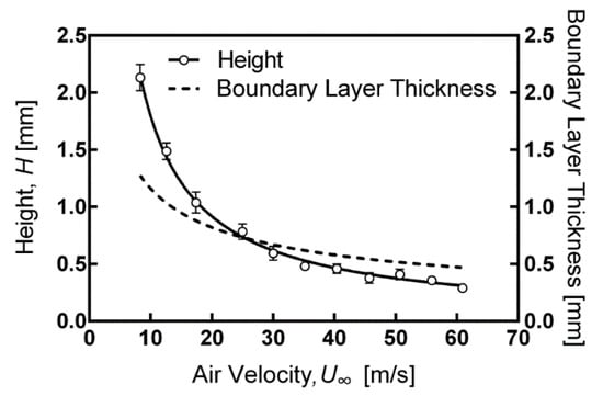 The critical droplet height related to the critical air velocity. This indicated that the correlation between the critical droplet height and air velocity was almost inversely proportional, shown as a solid fitted curve. The error bar of the height was given as the standard deviation. The dashed line is the numerically estimated boundary layer thickness by the Blasius exact solution []. The droplet is fully immersed in the boundary layer when U∞ is greater than 30 m/s.
