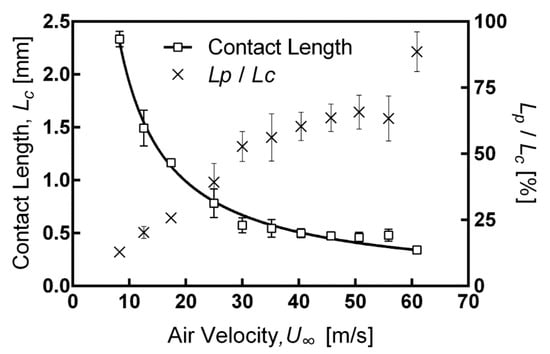 If the adhesive force is dominant and the pinning force is negligible, the correlation between the size of the droplet and the critical air velocity would not follow Equation (10), but would still be inversely proportional. As can be seen in Figure 5, the contact length, Lc, decreases with increasing air velocity. If we assume the pore size is reduced, the ratio of Lp and Lc is reduced. Because of the decrease in the ratio, the overall Lc value would rise, keeping the inverse relationship.