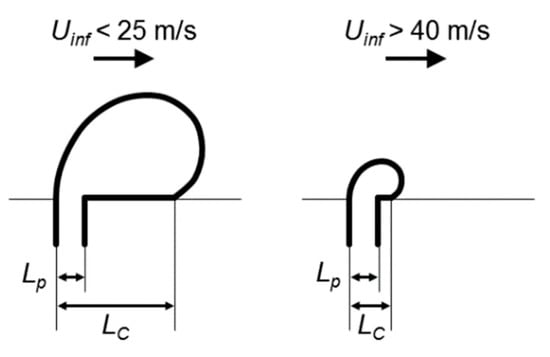 The shedding of a sessile droplet is dependent on the surface property of the aerodynamic object and the airflow. If we choose a superhydrophobic coating as the former factor, it promotes the mobility of a sessile droplet due to its anti-wettability, low adhesion, water repellency, and self-cleaning abilities [,,,,]. For the latter factor, the airflow creates aerodynamic drag. The shedding of a sessile droplet can be influenced by the magnitude of air velocity and the cross-sectional area of the droplet exposed to the airflow. When we consider a droplet on a surface under airflow, we need to take into account a velocity profile in a boundary layer. Based on the air velocity, the boundary layer will be thicker than the cross-sectional area of the droplet, or the droplet will be larger than the boundary layer thickness. Inside the boundary layer, the droplet can experience a velocity gradient that may influence the incipient motion and critical droplet size.
