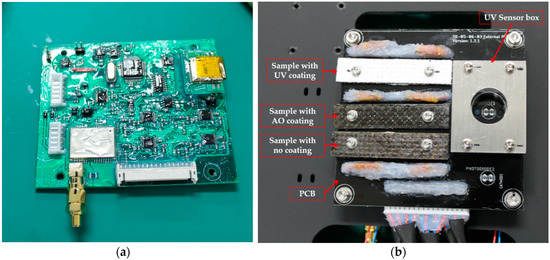 MM main components. (a) Internal printed circuit board (PCB) contains MM electronic circuit; (b) external PCB contains the Carbon Fibre/Polyether Ether Ketone (CF/PEEK) samples, strain gauges and temperature sensors.