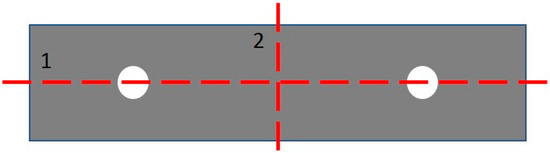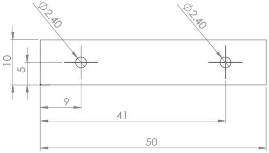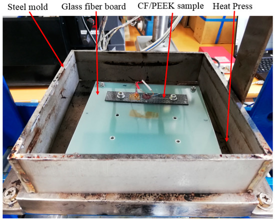 The dimensions of the external PCB measured 78 × 80 mm. Three CF/PEEK samples were bolted to the external PCB. Each sample consisted of two pieces of CF/PEEK thermally welded together using a heat press machine. The overall dimension of each sample was 50 mm long, 10 mm wide and 2 mm thick, as illustrated in Figure 3.