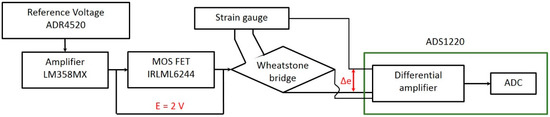 The block diagram for the strain gauge circuit is shown in Figure 7. The ADR4520 voltage regulator (Analog Devices, Norwood, MA, USA) was used to convert the 5 V power supply from battery to 2 V input voltage for the strain gauge. The low noise (0.1 Hz to 10 Hz) and wide operating temperature (−40 to 125 °C) were the reasons for selecting ADR4520. The LM358-N (Texas Instruments, Dallas, TX, USA) operational amplifier was used to provide high input impedance. The reason for the high input impedance was to minimize the drop in the voltage input. The LM358-N was selected due to its proven flight heritage in the Shinen-2 project. An IRLML6244 MOSFET (Infineon Technologies, Neubiberg, Germany) was used to provide a switching circuit. The varying temperature in LEO can also affect the resistance of the lead wire. The 3-lead wire strain gauge was selected for self-temperature compensation. The minute change in resistance was converted by the Wheatstone quarter bridge to voltage change, ∆e0. The ADS1220 (Texas Instruments, Dallas, TX, USA), a 24-bit analogue-to-digital converter (ADC) was used to amplify the value of ∆e0 which was in the μV range. Each of the 2-element strain gauges was connected to two ADC with one ADC for each gauge element.